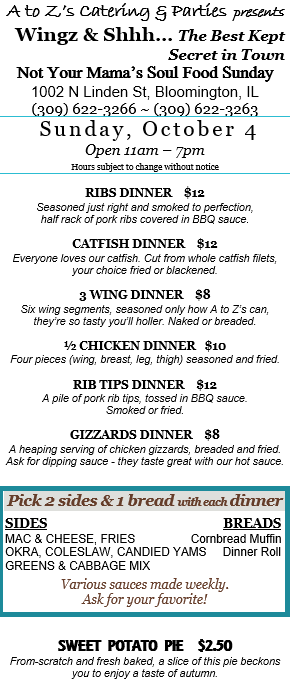 We’re back with more tasty soul food delights this Sunday, October 4, 11:00 AM – 7:00 PM. Did you know that our Apple Butter BBQ Sauce is back? Celebrate fall with us! Call 309-622-3263 or 309-622-3266 to place your order about 15 to 30 minutes prior to your desired pick-up time, and use our drive-thru to pick up. We look forward to seeing you this Sunday!