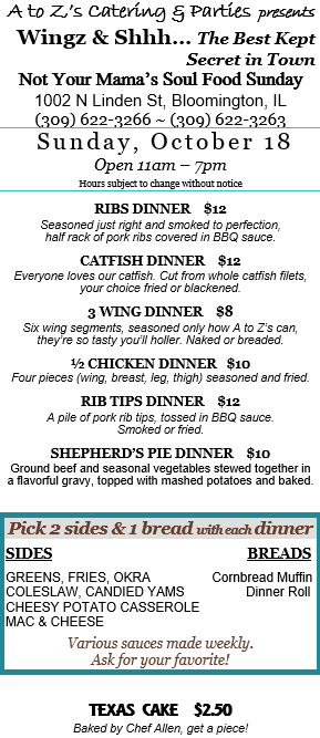 Stop by this Sunday for some delicious soul food. Cooked to order, call and place your order about 20 minutes before you’d like to pick up. Use our drive thru.