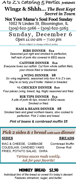 Get your soul food 11:00 AM to 7:00 PM this Sunday, December 6. Call in your order about 20-30 minutes before you’d like your food, and use our drive-thru to pick up. 309-622-3263 and 309-622-3266.