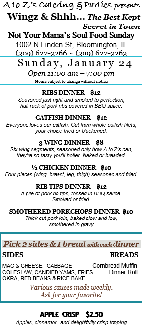 Get your carryout soul food 11:00 AM to 7:00 PM* this Sunday, January 24. Call to place your order (309-622-3263 and 309-622-3266) and use our drive-thru to pick up. We look forward to seeing you!