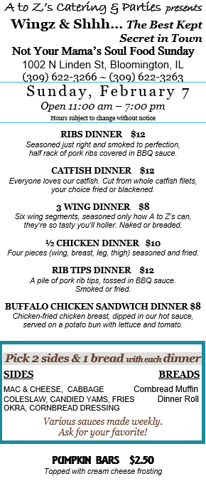 Get yourself some hot and tasty A to Z’s soul food this Sunday! Along with our standard Sunday menu items, this week’s sides include cabbage and cornbread dressing. Try our Buffalo Chicken Sandwich or pumpkin bars. We look forward to seeing you!