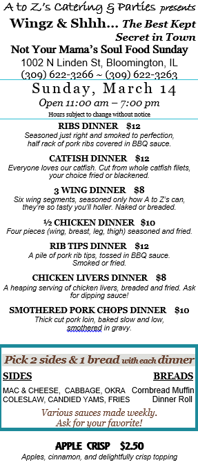 11:00 AM to 7:00 PM, Sunday, March 14, get your soul food here!