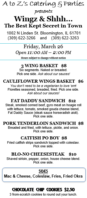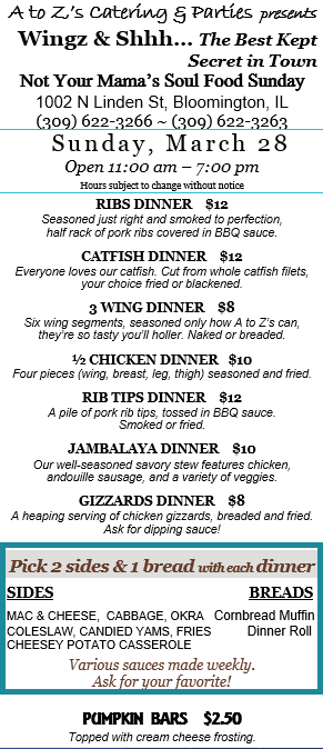 Folks – this week we’re selling carry out two days: 11am to 2pm Friday, March 26, is lunch. (Closed Saturday, March 27, for a funeral.) 11am to 7pm Sunday, March 28, get your soul food here!