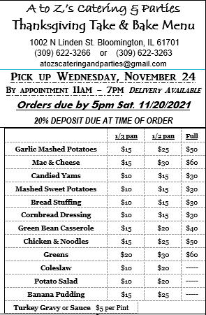 A to Z’s Catering & Parties is again providing our fantastic Thanksgiving Take & Bake Menu! Get your Thanksgiving favorites, prepared and refrigerated with heating instructions, so you choose when to celebrate with your family and friends.