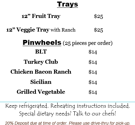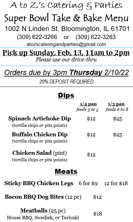 Get your Super Bowl food from A to Z’s Catering & Parties! Prepared and refrigerated, this food comes with easy to use heating instructions (as applicable). Pick up Sunday, February 13, 11:00 am to 2:00 pm.