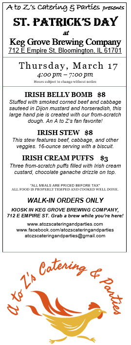 Celebrate St. Patrick’s Day at Keg Grove Brewing Company, 4:00 PM to 7:00 PM*, Thursday, March 17! Swing by Keg Grove Brewing Company at 712 E Empire St, Bloomington, IL 61701 (just around the corner from A to Z’s) this St. Patrick’s Day. No call-in or emailed orders will be accepted. Grab some locally crafted brews and food!