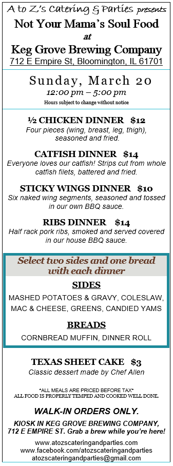 We will also be back with soul food this Sunday noon to 5:00 PM. Two great opportunities to swing by Keg Grove Brewing Company to enjoy some brews and delicious A to Z’s food.