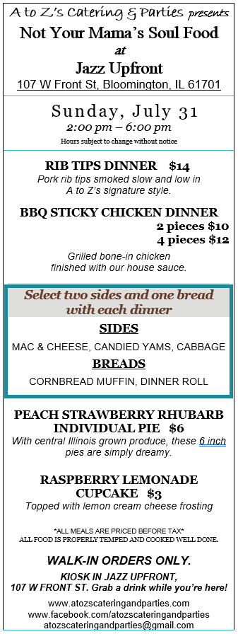 2:00 PM to 6:00 PM, Sunday, July 31, we are selling carryout at Jazz Upfront, 107 W Front St, in downtown Bloomington. Come get your carryout and don’t forget dessert!