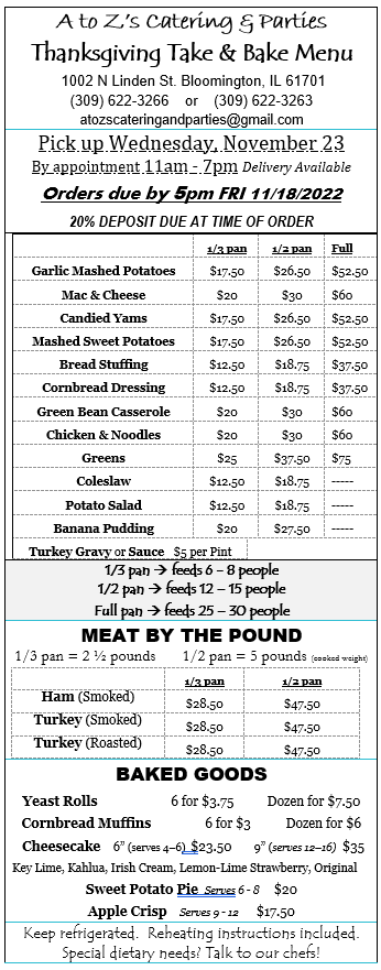 You’ve been clamoring for it – A to Z’s 2022 Thanksgiving Take & Bake Menu is here! Orders and deposits are due no later than 5:00 PM, Friday, November 18.