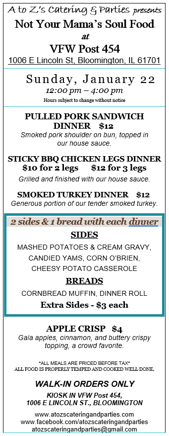 Get your A to Z’s food this weekend! Noon to 4:00 PM Sunday, January 22, stop by our kiosk in VFW Post 454 (1006 E Lincoln St, Bloomington, IL 61701) and get your soul food. Stay and eat or take to go. We look forward to feeding you!