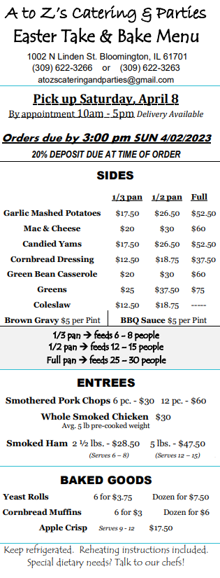 A to Z’s Easter Take & Bake Menu is now live! Orders and deposits due no later than 3:00 PM, Sunday, April 2. Place your order at 309-622-3266 or 309-622-3263. Deposits are accepted with card by phone. Remaining balance due upon pick-up/delivery. Order now!