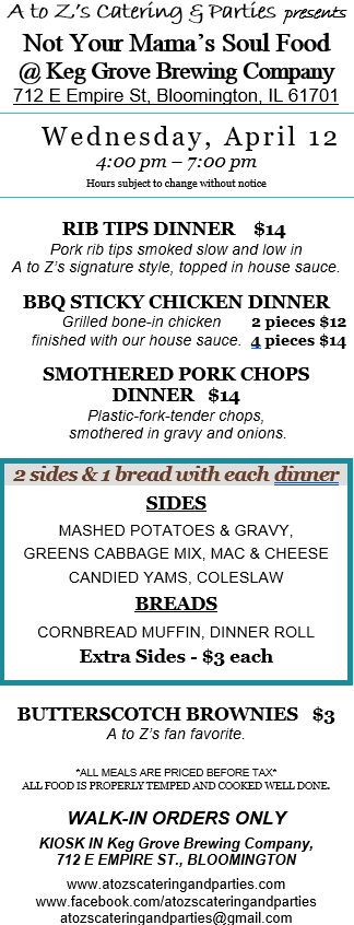 You’ve been clamoring to get our food outside of catered events, so come see us at Keg Grove Brewing Company (712 E Empire St, Bloomington, 61701). Join us 4:00 PM to 7:00 PM Wednesday, April 12; Friday, April 14. Also (time and menu pending) join us for your favorite spring holiday Thursday 4/20.