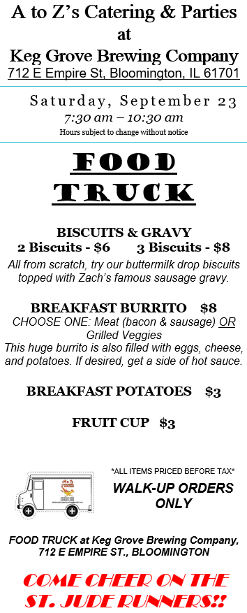 ~~~~~~~~~~~~~~~~~~~~~~~~~~~~~~~~~~~~~~~~~~~~~~~~~~~~~~~~~ Admit it – you’ve missed our delicious breakfast foods. We’re back at Keg Grove Brewing Company this Saturday morning to help cheer on those who are participating in the St. Jude Run. Come out early, cheer on runners, and get your breakfast!
