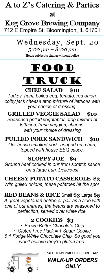 Other upcoming dates: most Wednesday evenings we’ll be at Keg Grove Brewing Company’s trivia night, mid-day Saturday 9/30 at Cookies grand opening event (JC Parkway, Bloomington), Saturday evening 9/30 Bruegala (downtown Bloomington), Friday evening 10/20 Oak & Flame‘s grand opening event in LeRoy, Saturday Octoberfest lunch 10/21 at Keg Grove. Menus will be posted a few days prior to each food truck outing.