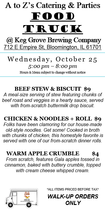We’re out and about this week with the food truck – come see us! Wednesday evening 10/25 we’re back with the good people at Keg Grove Brewing Company.
