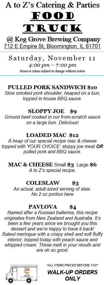 Folks, three opportunities this week to get our tasty food! We’re back at Keg Grove Brewing Company Saturday evening, November 11.