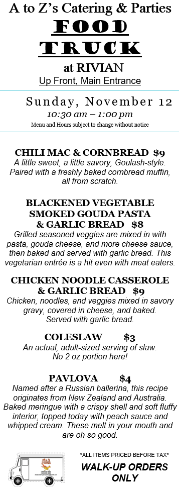 Grab lunch Sunday 11/12 near the main entrance at Rivian.
