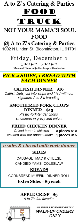 Other upcoming food truck dates: Back to Analytical Brewing (Lexington) Sat 12/9. Friday 12/15 we’re at Keg Grove Brewing Company. Saturday 12/16 we’re in downtown Bloomington – hosted by The Painted Wraith, get your pictures with Krampus! Evening Saturday 12/16 we’re at Keg Grove Brewing Co. for their gingerbread decorating event. Back to Keg Grove Brewing Co. Monday 12/18 for holiday-themed Trivia Night, Friday 12/29, and Saturday 12/30.