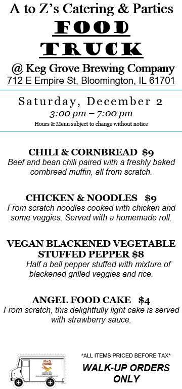 Other upcoming food truck dates: Back to Analytical Brewing (Lexington) Sat 12/9. Friday 12/15 we’re at Keg Grove Brewing Company. Saturday 12/16 we’re in downtown Bloomington – hosted by The Painted Wraith, get your pictures with Krampus! Evening Saturday 12/16 we’re at Keg Grove Brewing Co. for their gingerbread decorating event. Back to Keg Grove Brewing Co. Monday 12/18 for holiday-themed Trivia Night, Friday 12/29, and Saturday 12/30.