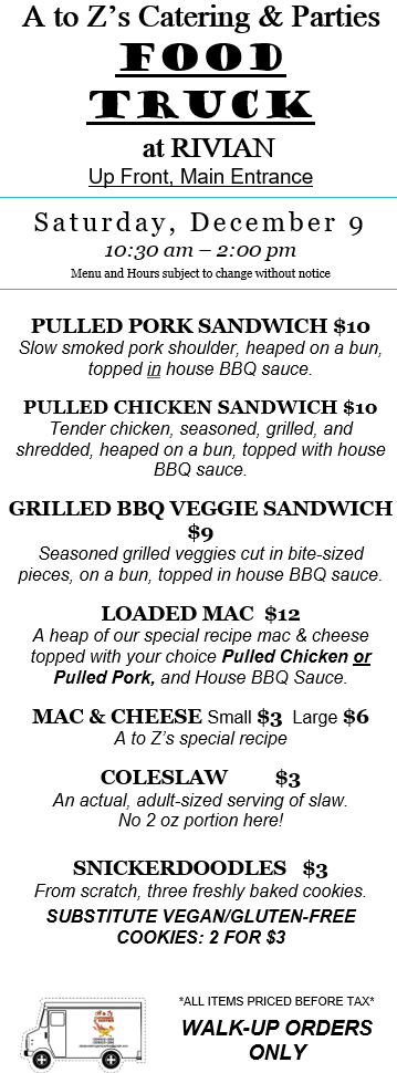 We’re back at Rivian Tuesday 12/12 evening into the night – likely in a zone restricted to employees only, but dang, what a tasty menu!