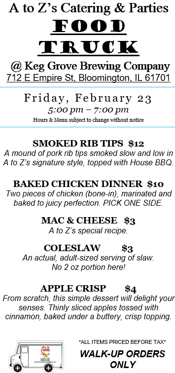 While we love our truck, we are primarily a catering company. Check out our 2024 Catering Menu. Call Kelly at 309-622-3263 or email us at atozscateringandparties@gmail.com. We prefer at least one week’s notice for any order to ensure we are available and have the correct supplies on hand. We require a non-refundable 20% deposit to book our services for any meal. Until a deposit is received, your desired day/time remains open for other customers. Want something you don’t see on the menu? Please ask! Our chefs have decades of cooking experience and can craft nearly any food.