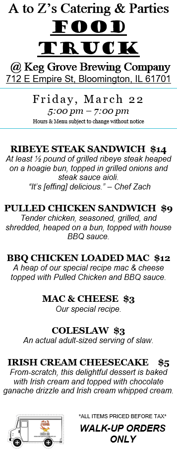 While we love our truck, we are primarily a catering company. Check out our 2024 Catering Menu. Call Kelly at 309-622-3263 or email us at atozscateringandparties@gmail.com. We prefer at least one week’s notice for any order to ensure we are available and have the correct supplies on hand. We require a non-refundable 20% deposit to book our services for any meal. Until a deposit is received, your desired day/time remains open for other customers. Want something you don’t see on the menu? Please ask! Our chefs have decades of cooking experience and can craft nearly any food.