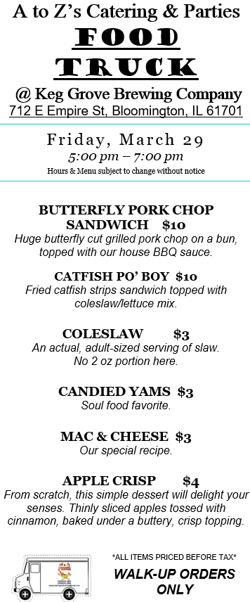 We’ll be back at Keg Grove Brewing Company Thursday evening 4/4 – menu coming soon!