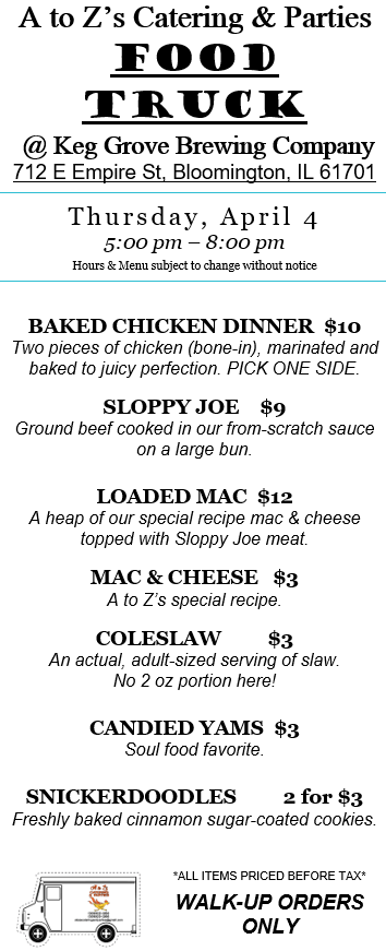While we love our truck, we are primarily a catering company. Check out our 2024 Catering Menu. Call Kelly at 309-622-3263 or email us at atozscateringandparties@gmail.com. We prefer at least one week’s notice for any order to ensure we are available and have the correct supplies on hand. We require a non-refundable 20% deposit to book our services for any meal. Until a deposit is received, your desired day/time remains open for other customers. Want something you don’t see on the menu? Please ask! Our chefs have decades of cooking experience and can craft nearly any food.