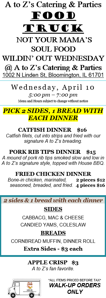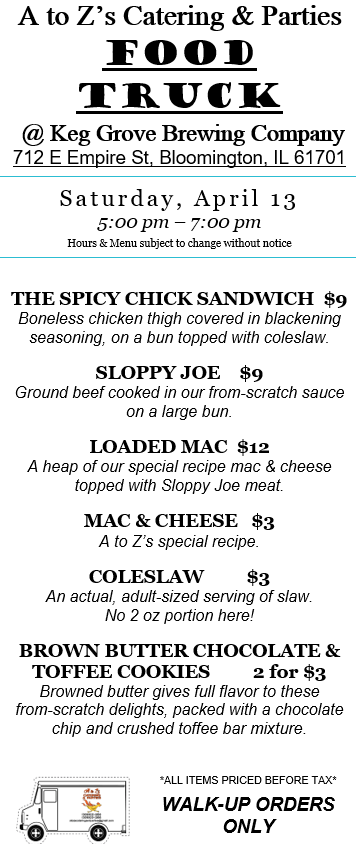 While we love our truck, we are primarily a catering company. Check out our 2024 Catering Menu. Call Kelly at 309-622-3263 or email us at atozscateringandparties@gmail.com. We prefer at least one week’s notice for any order to ensure we are available and have the correct supplies on hand. We require a non-refundable 20% deposit to book our services for any meal. Until a deposit is received, your desired day/time remains open for other customers. Want something you don’t see on the menu? Please ask! Our chefs have decades of cooking experience and can craft nearly any food.