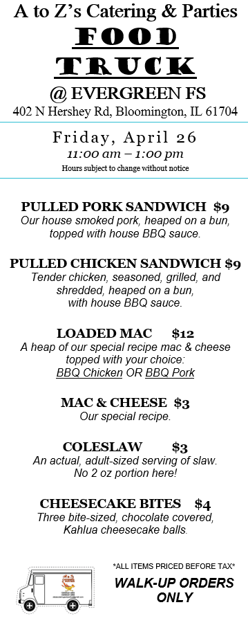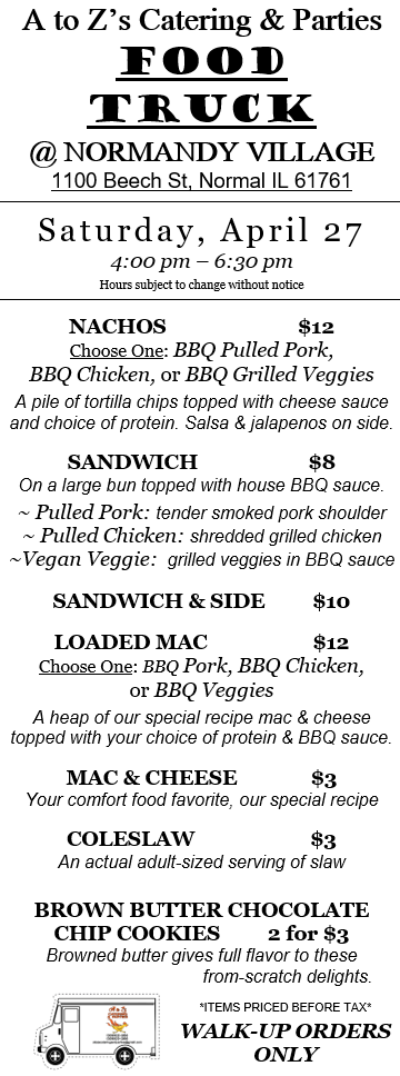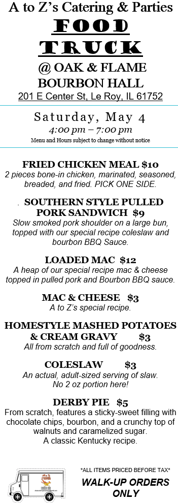 While we love our truck, we are primarily a catering company. Check out our 2024 Catering Menu. Call Kelly at 309-622-3263 or email us at atozscateringandparties@gmail.com. There is sometimes a 2-week delay in email replies. Please call Kelly for more immediate assistance. We prefer at least one week’s notice for any order to ensure we are available and have the correct supplies on hand. We require a non-refundable 20% deposit to book our services for any meal. Until a deposit is received, your desired day/time remains open for other customers. Want something you don’t see on the menu? Please ask! Our chefs have decades of cooking experience and can craft nearly any food.