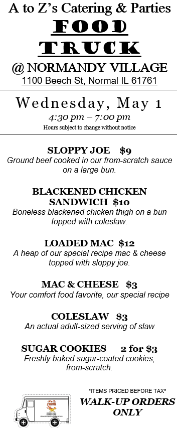 Wednesday afternoon/evening May 1 we’ll be back at Normandy Village (Normal).
