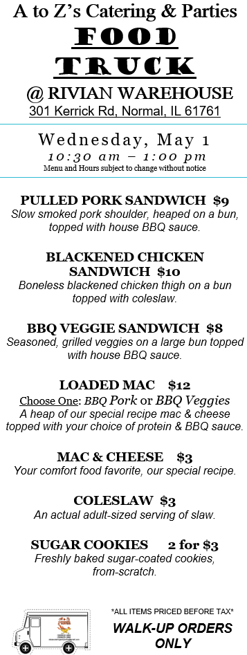 While we love our truck, we are primarily a catering company. Check out our 2024 Catering Menu. Call Kelly at 309-622-3263 or email us at atozscateringandparties@gmail.com. There is sometimes a 2-week delay in email replies. Please call Kelly for more immediate assistance. We prefer at least one week’s notice for any order to ensure we are available and have the correct supplies on hand. We require a non-refundable 20% deposit to book our services for any meal. Until a deposit is received, your desired day/time remains open for other customers. Want something you don’t see on the menu? Please ask! Our chefs have decades of cooking experience and can craft nearly any food.