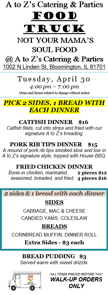 Get your soul food Tuesday, April 30. Ooooh, you know you want some. Starting an hour earlier, see us in our lot 4:00 PM to 7:00 PM. Take our word for it, you wanna try the bread pudding.