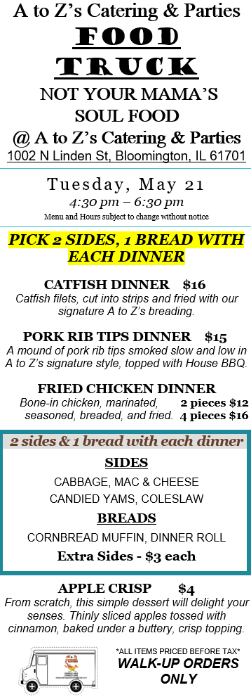 While we love our truck, we are primarily a catering company. Check out our 2024 Catering Menu. Call Kelly at 309-622-3263 or email us at atozscateringandparties@gmail.com. There is sometimes a 2-week delay in email replies. Please call Kelly for more immediate assistance. We prefer at least one week’s notice for any order to ensure we are available and have the correct supplies on hand. We require a non-refundable 20% deposit to book our services for any meal. Until a deposit is received, your desired day/time remains open for other customers. Want something you don’t see on the menu? Please ask! Our chefs have decades of cooking experience and can craft nearly any food.