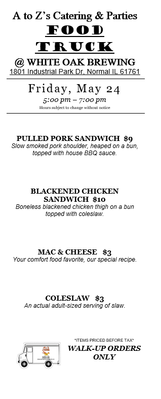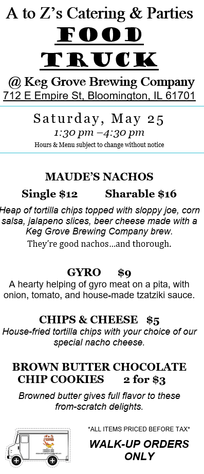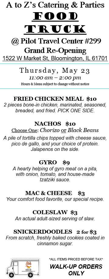 While we love our truck, we are primarily a catering company. Check out our 2024 Catering Menu. Call Kelly at 309-622-3263 or email us at atozscateringandparties@gmail.com. There is sometimes a 2-week delay in email replies. Please call Kelly for more immediate assistance. We prefer at least one week’s notice for any order to ensure we are available and have the correct supplies on hand. We require a non-refundable 20% deposit to book our services for any meal. Until a deposit is received, your desired day/time remains open for other customers. Want something you don’t see on the menu? Please ask! Our chefs have decades of cooking experience and can craft nearly any food.