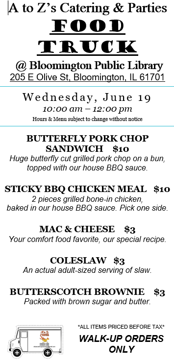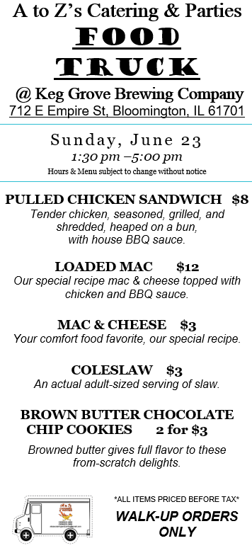 While we love our truck, we are primarily a catering company. Check out our 2024 Catering Menu. Call Kelly at 309-622-3263 or email us at atozscateringandparties@gmail.com. There is sometimes a 2-week delay in email replies. Please call Kelly for more immediate assistance. We prefer at least one week’s notice for any order to ensure we are available and have the correct supplies on hand. We require a non-refundable 20% deposit to book our services for any meal. Until a deposit is received, your desired day/time remains open for other customers. Want something you don’t see on the menu? Please ask! Our chefs have decades of cooking experience and can craft nearly any food.