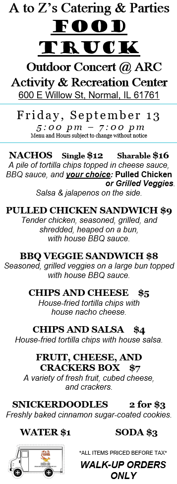 Friday we’re at the Activity & Recreation Center’s outdoor concert. Find us at the intersection of Willow and Beech in Normal this Friday evening!