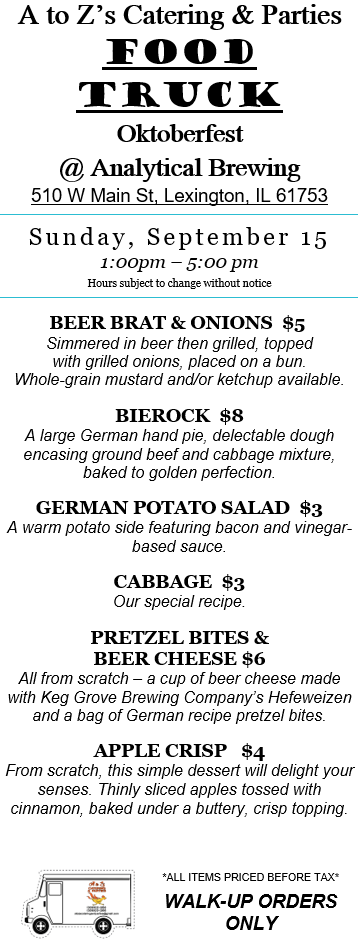 While we love our truck, we are primarily a catering company. Check out our 2024 Catering Menu. Call Kelly at 309-622-3263 or email us at atozscateringandparties@gmail.com. There is sometimes a 2-week delay in email replies. Please call Kelly for more immediate assistance. We prefer at least one week’s notice for any order to ensure we are available and have the correct supplies on hand. We require a non-refundable 20% deposit to book our services for any meal. Until a deposit is received, your desired day/time remains open for other customers. Want something you don’t see on the menu? Please ask! Our chefs have decades of cooking experience and can craft nearly any food.