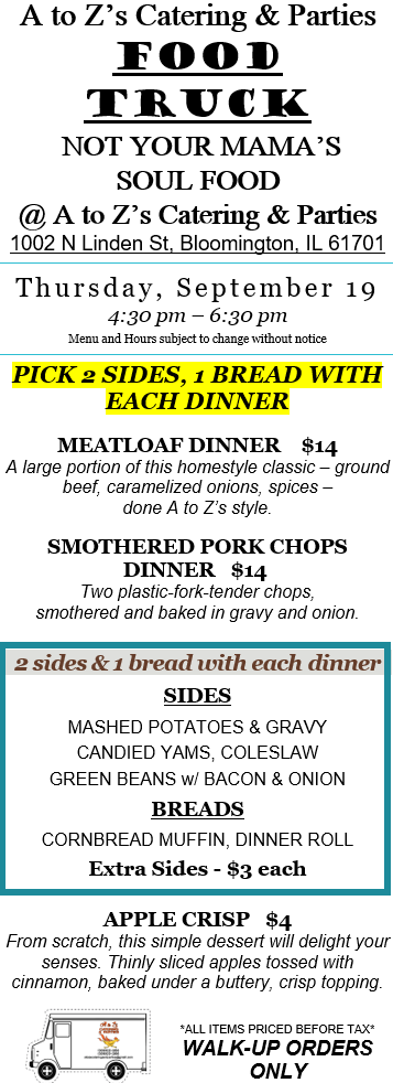 While we love our truck, we are primarily a catering company. Check out our 2024 Catering Menu. Call Kelly at 309-622-3263 or email us at atozscateringandparties@gmail.com. There is sometimes a 2-week delay in email replies. Please call Kelly for more immediate assistance. We prefer at least one week’s notice for any order to ensure we are available and have the correct supplies on hand. We require a non-refundable 20% deposit to book our services for any meal. Until a deposit is received, your desired day/time remains open for other customers. Want something you don’t see on the menu? Please ask! Our chefs have decades of cooking experience and can craft nearly any food.