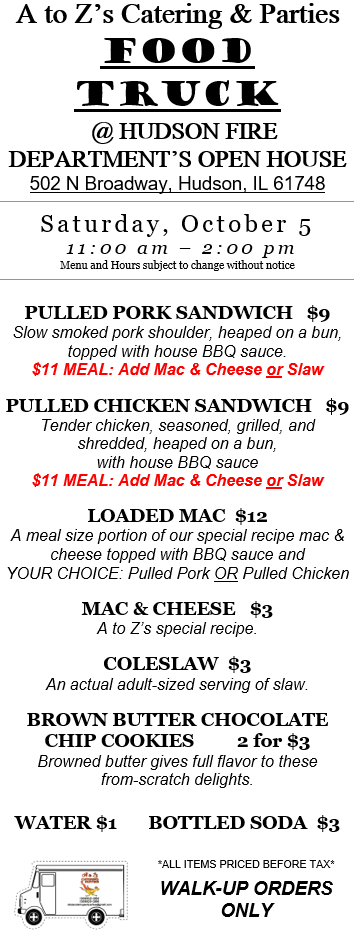 Saturday 10/5 we’ll be serving lunch at the Hudson Fire Department’s open house. Stop by to tour the firehouse and grab some lunch!