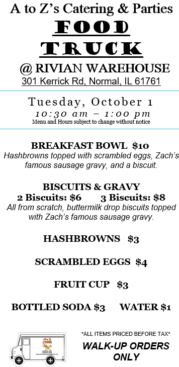Tuesday 10/1 we’re serving breakfast for lunch at the Rivian Warehouse on Kerrick Road in north Normal. Open to the public!