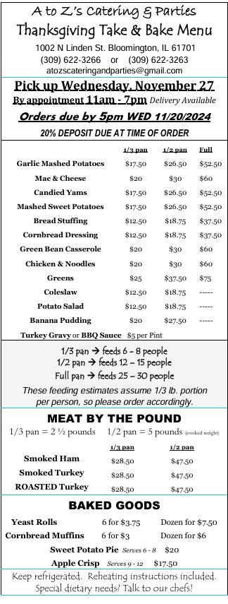 The food is packaged, refrigerated, and given to you with reheating instructions. Save yourself some prep time and bring a taste of A to Z’s Catering & Parties to your holiday gathering!