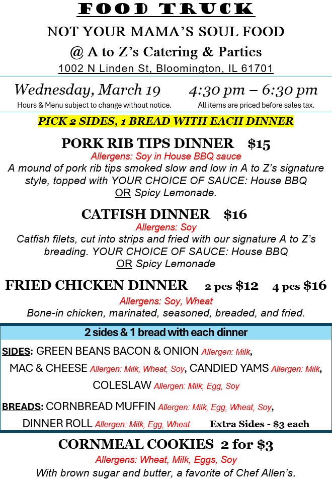 Come out to our lot Wednesday, March 19, for some of your soul food favorites. Spicy Lemonade sauce is back! Rain or shine.