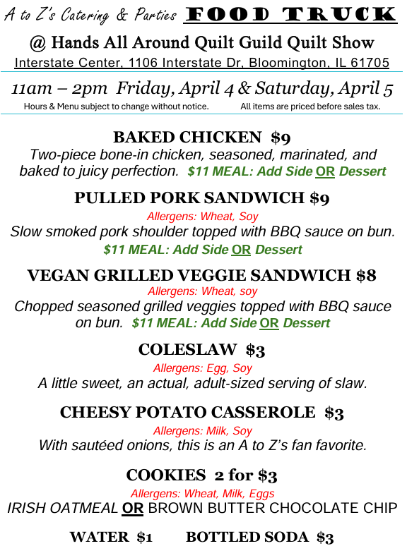 Folks, we’re glad to greet this warmer weather with our food truck! Tuesday, April 1, we’re doing lunch at the Rivian Warehouse in North Normal – OPEN TO THE PUBLIC!