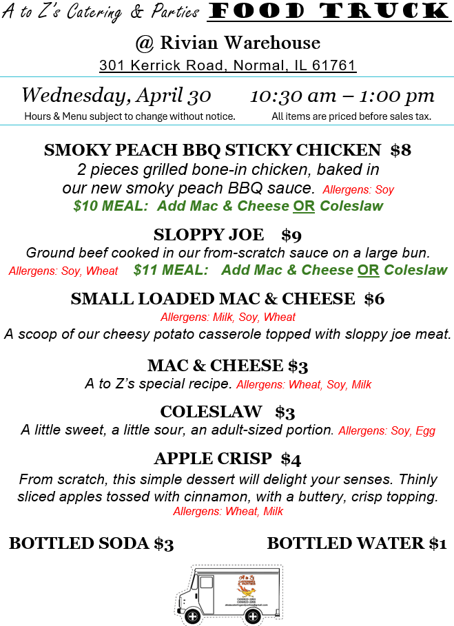 Wednesday, April 30, we’re serving lunch at the Rivian Warehouse in North Normal – open to the public! We’re unveiling a new BBQ sauce creation. Come on by!