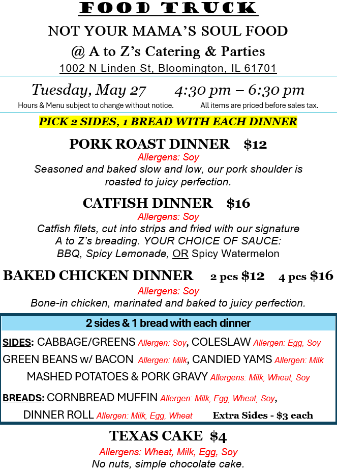 TUE 5/27 SOUL FOOD 4:30-6:30PM May 27, 2025 a to z's catering and parties Come to our lot for some tasty soul food gems! . Share this: Click to share on X (Opens in new window) X Click to share on Facebook (Opens in new window) Facebook Like Loading... Related