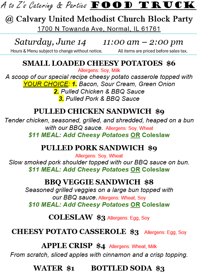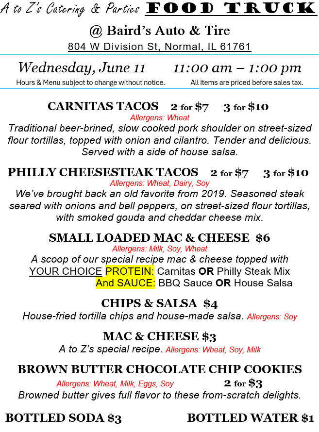 Folks – join us for lunch! Wednesday, June 11, we’ll be at Baird’s Auto & Tire in Normal (parked on the Center Street side). Saturday, June 14, we’re at Calvary UMC’s Block Party on Towanda Avenue. Times and addresses are on the menus below. We look forward to seeing you!