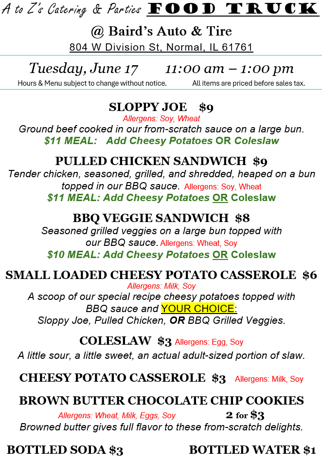 We had such fun last week that we’re back at Baird’s Auto & Tire (intersection Center and Division Streets) for lunch Tuesday, June 17. Come on out!