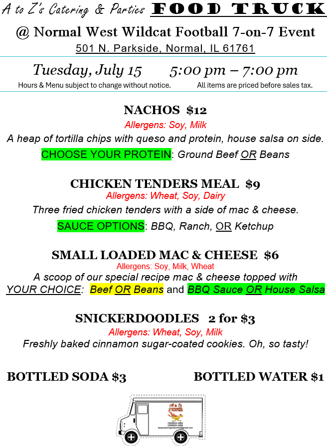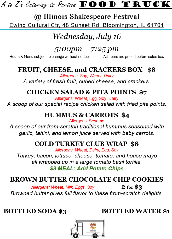Tuesday evening 7/15, our food truck will be at the Normal West High School football field for a 7-on-7 scrimmage event; Wednesday evening 7/16 selling cool items at IL Shakespeare Festival to beat the heat; and again Saturday evening 7/19 we’ll be back at Shakespeare fest. Details in menus below.