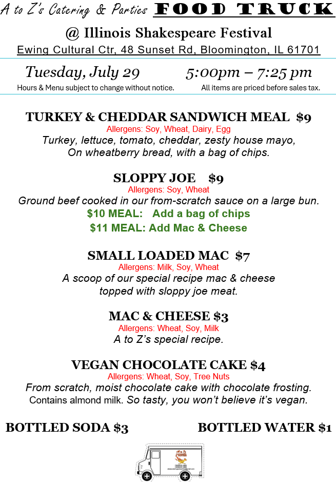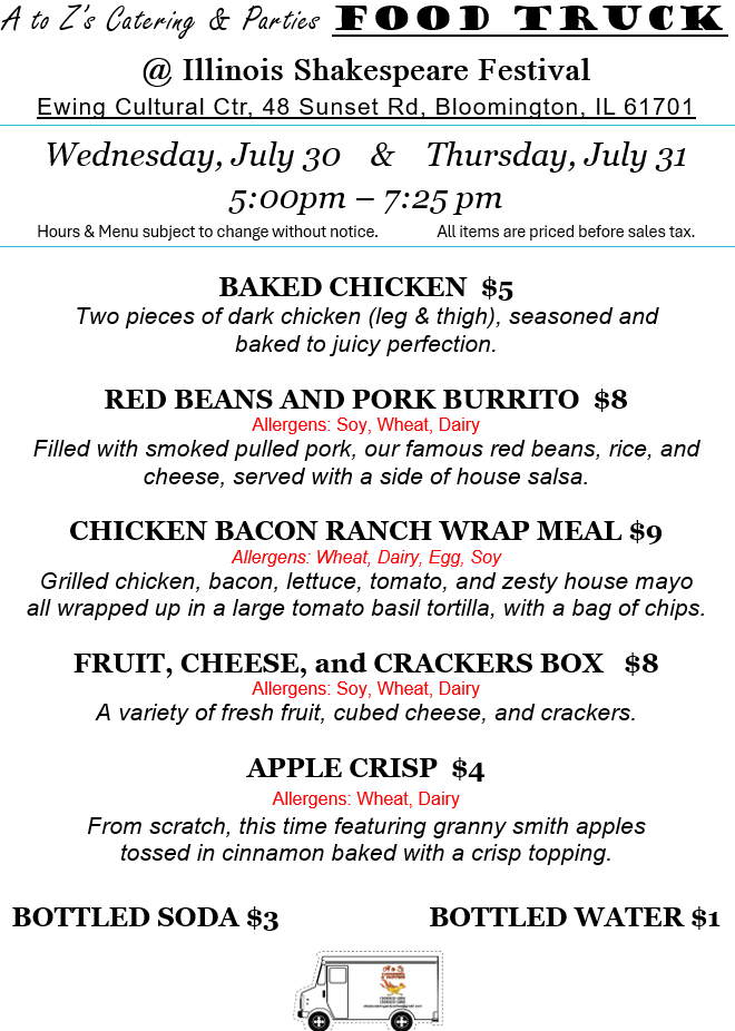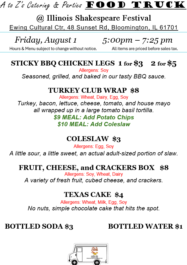 We’re out Tuesday through Friday this week at the Illinois Shakespeare Festival. Come on out, grab some tasty food, picnic on the lawn, and see a show!